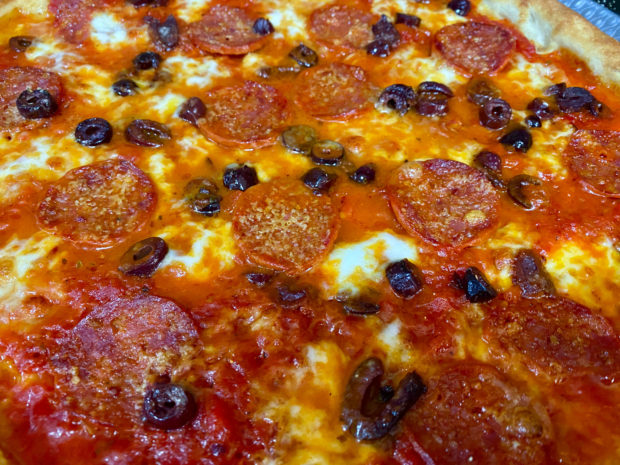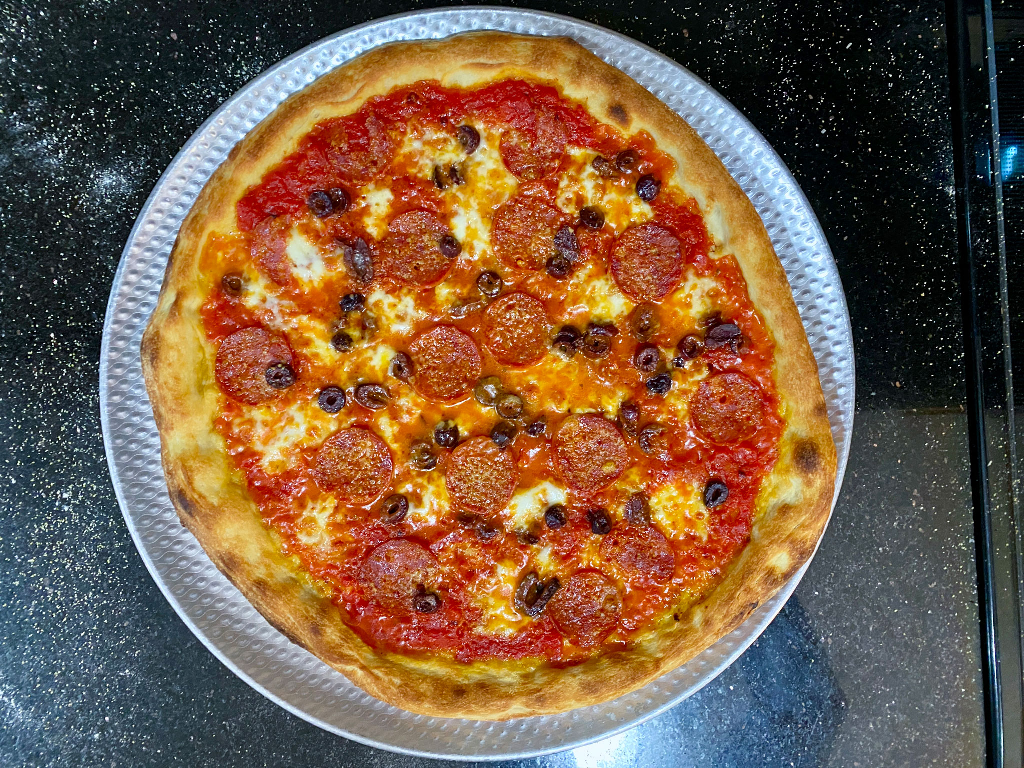 As I said, I baked this in a conventional home oven. I have a pizza stone on the bottom rack, and a pizza steel on the top rack. The oven gets preheated to 525º F, and then holds for one hour before baking the pizza. (If your oven will go to 550º, do that, and if you have convection, do that too.)